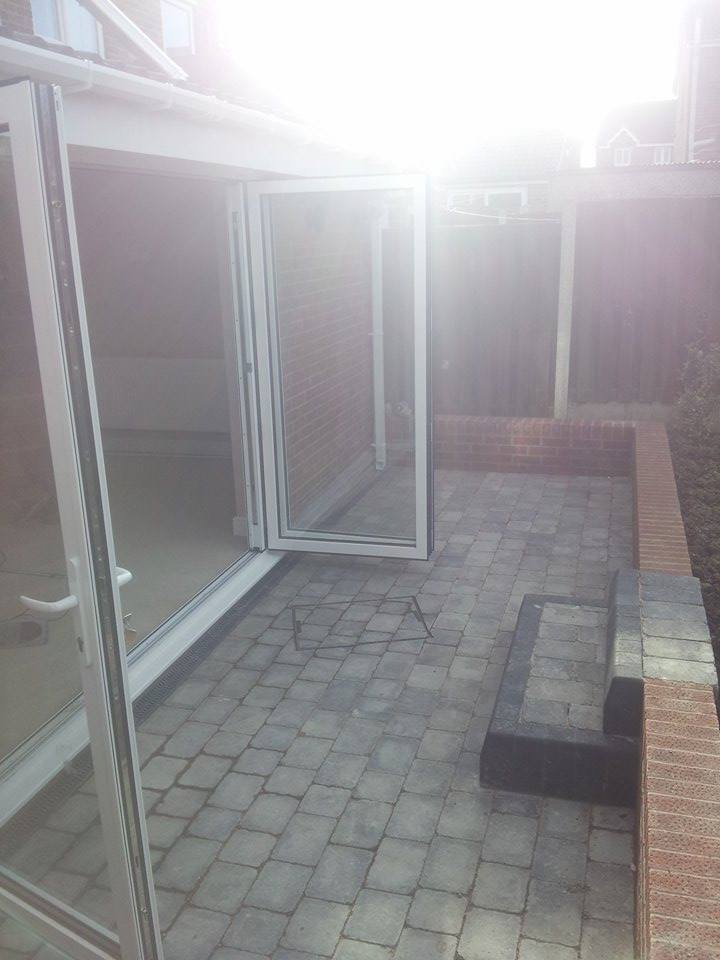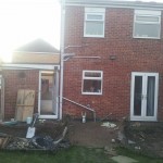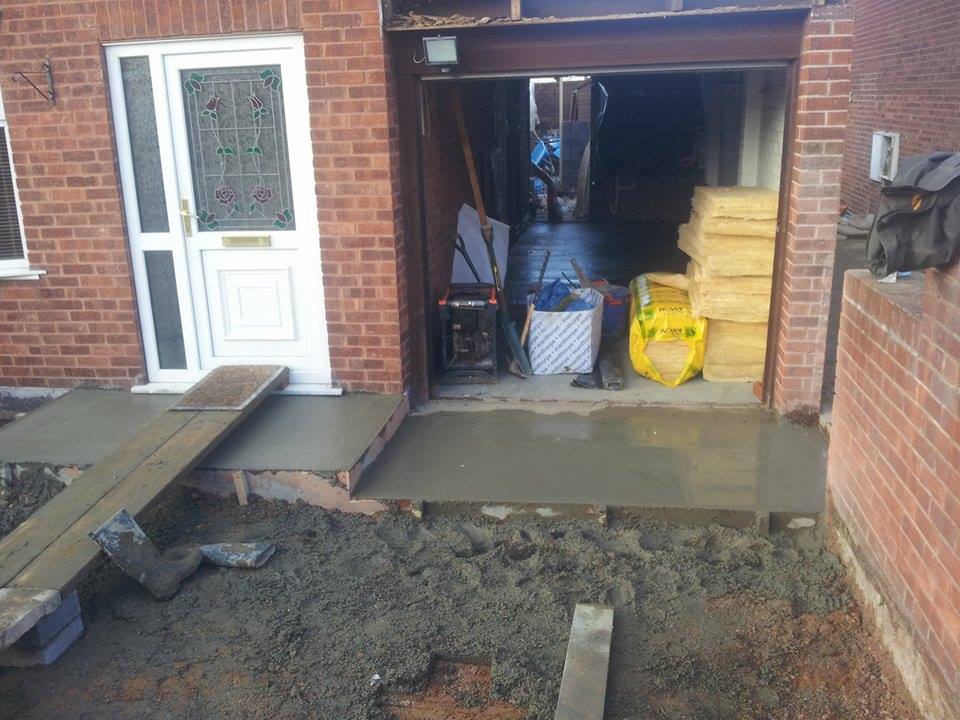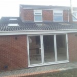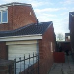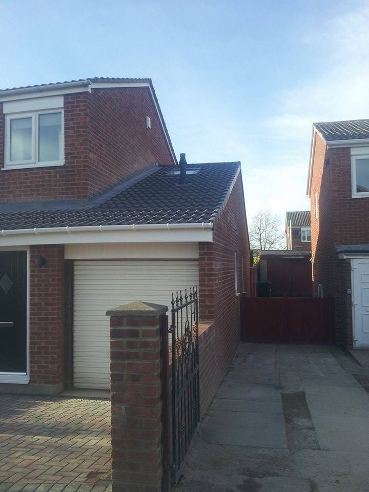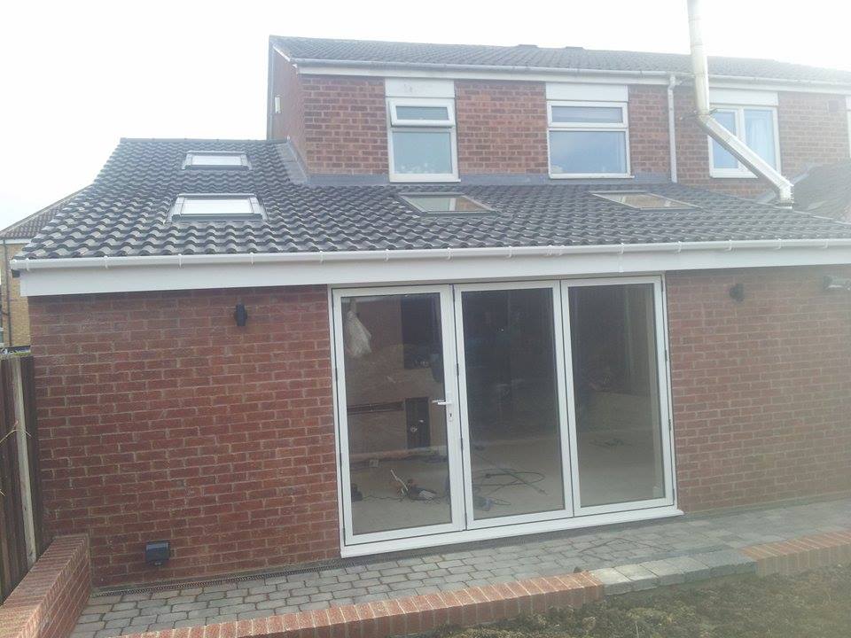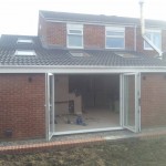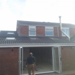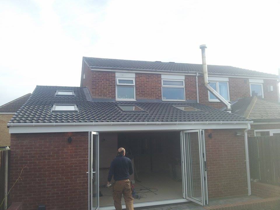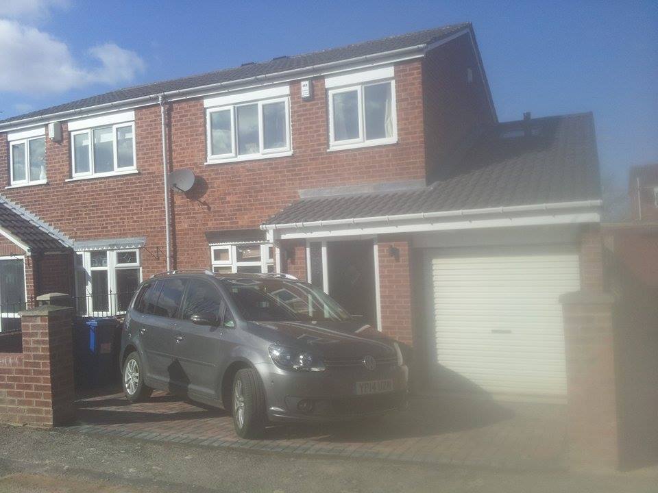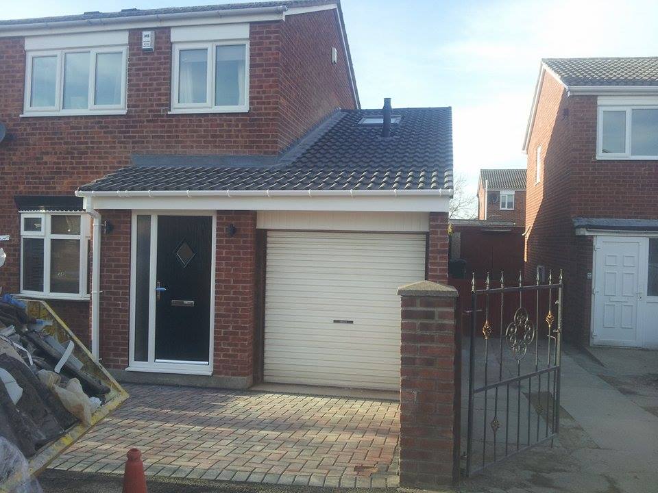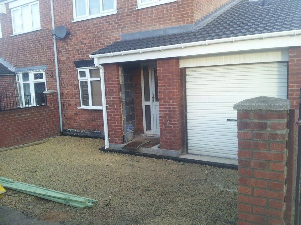 We constructed a rear extension with vaulted ceiling, Bi fold doors, the roof then carried on over existing side garage round onto front elevation where we extended garage to the front and constructed a front porch. Also block paved front area.