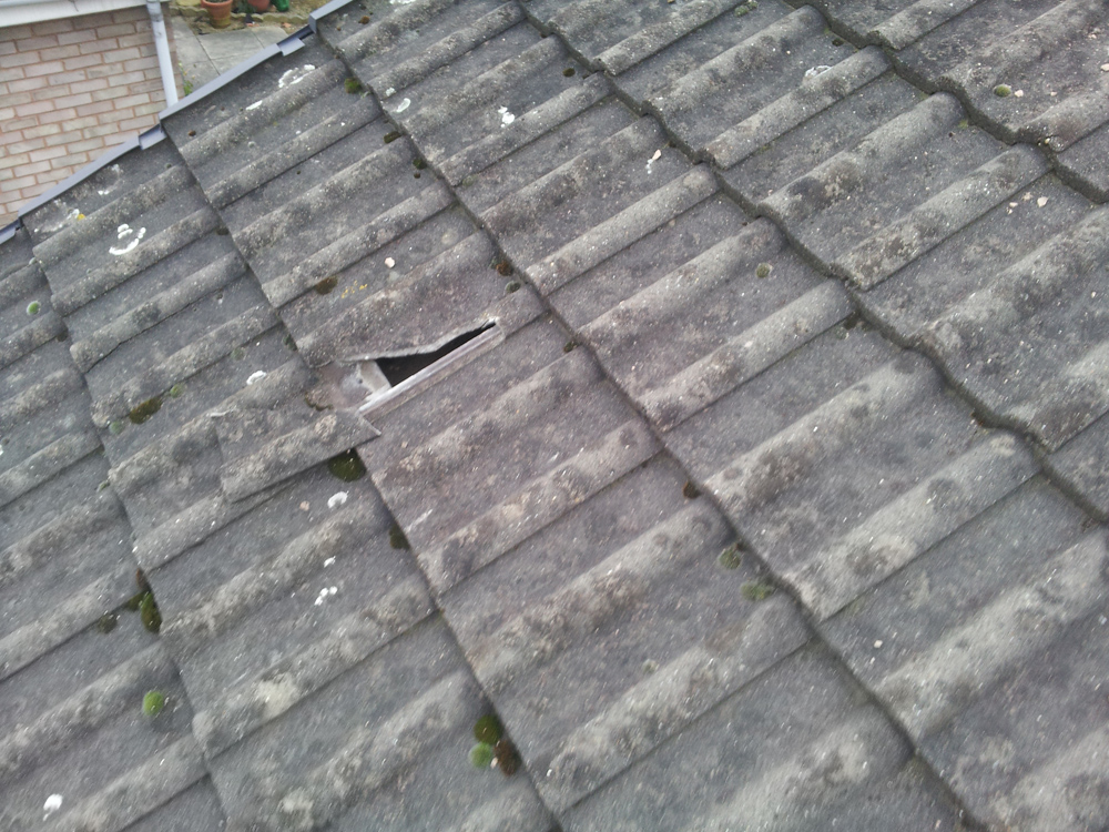 Photos display broken roof tiles with an approximate age of 60 years old, needing replacement.
